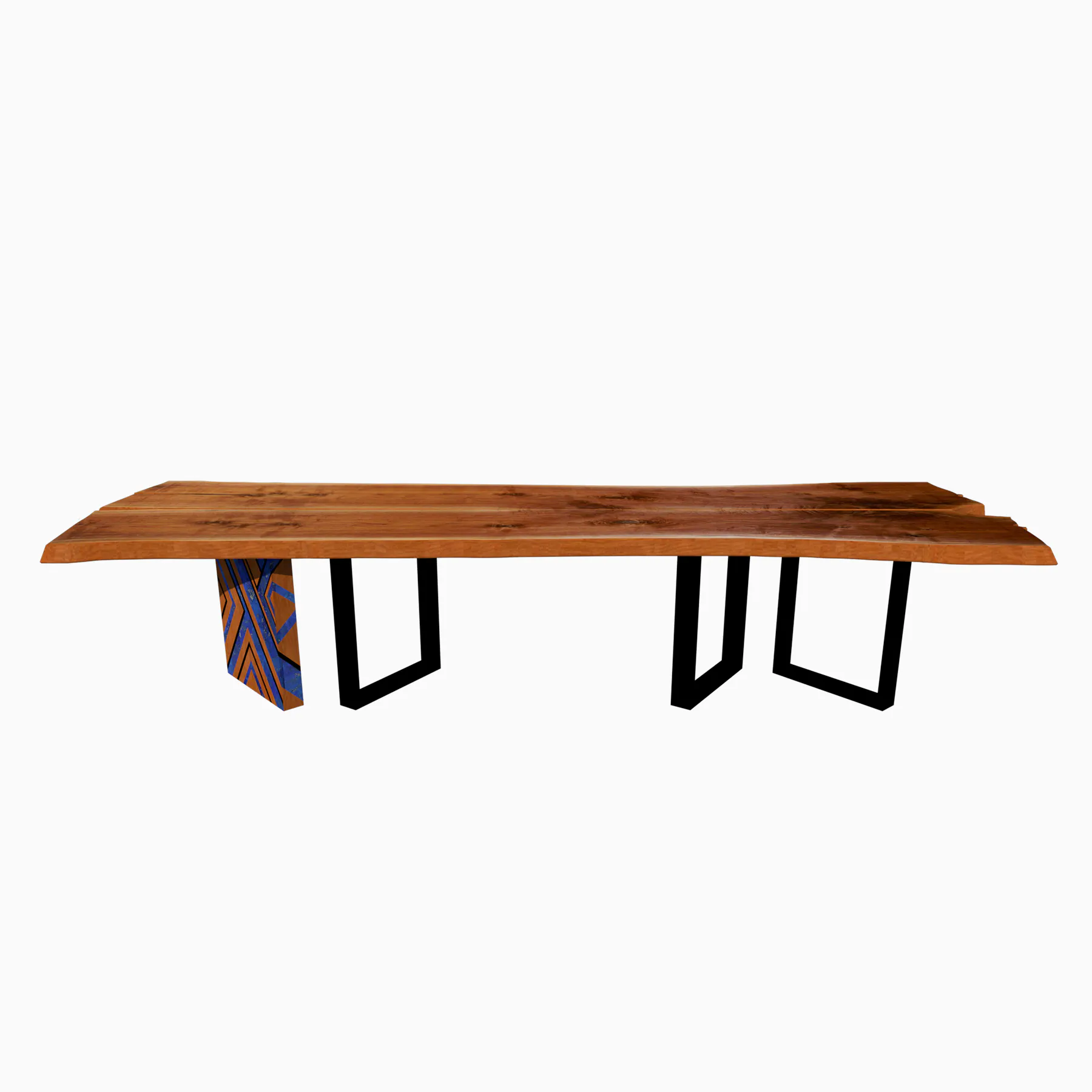 A statement piece that blends strength and artistry this dining table features wooden and metal legs adorned with exquisite lapis inlay, adding a touch of timeless elegance to modern craftsmanship.