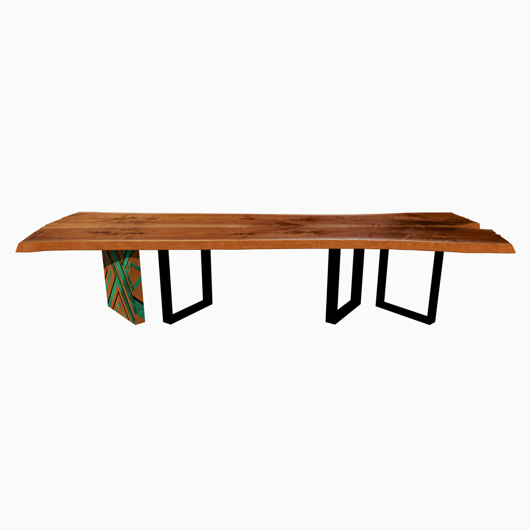 A statement piece that blends strength and artistry this dining table features wooden and metal legs adorned with exquisite malachite inlay, adding a touch of timeless elegance to modern craftsmanship.