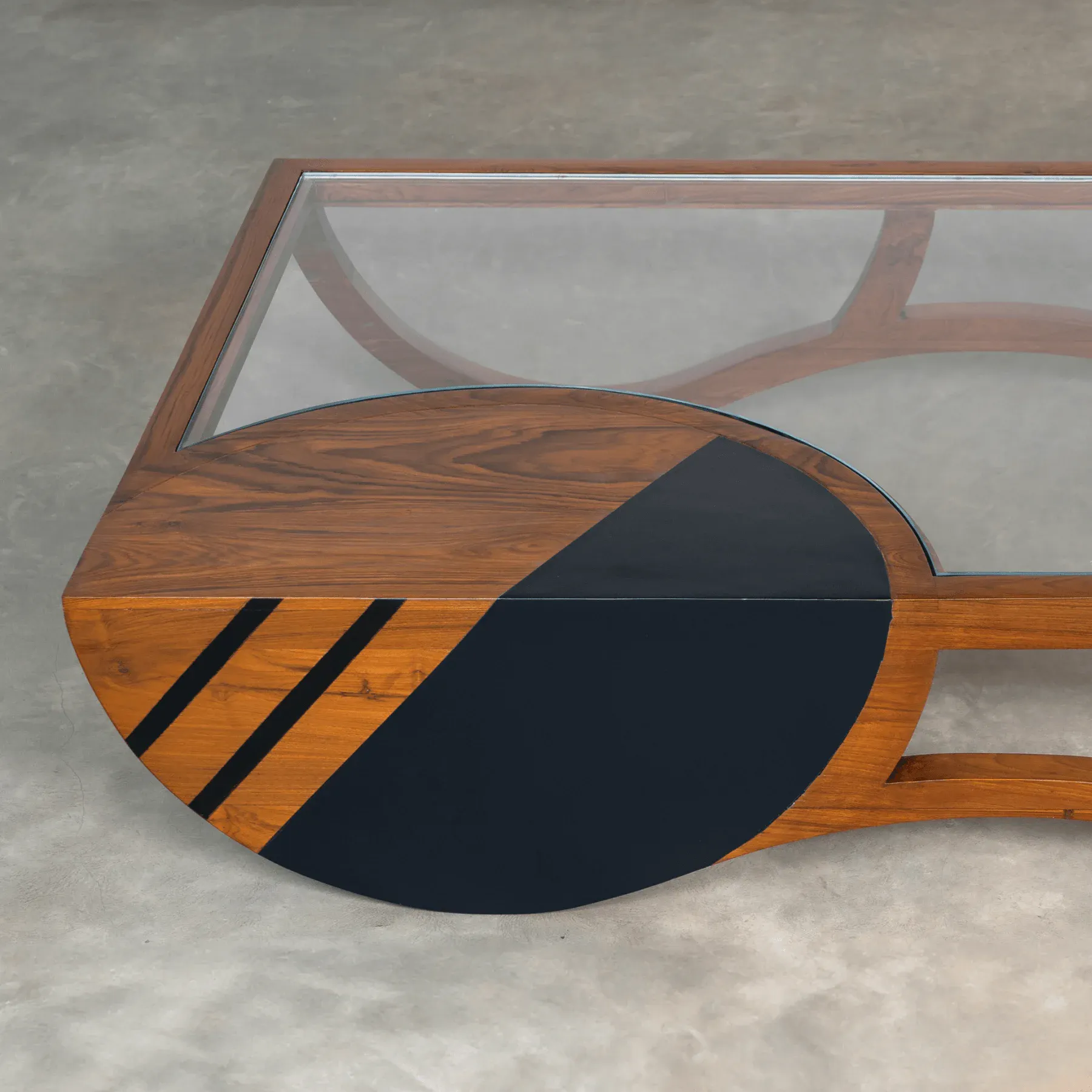 Glass and wood in fluid harmony, this table pairs carved lines with a bold circular feature, echoing tribal forms through a modern lens.